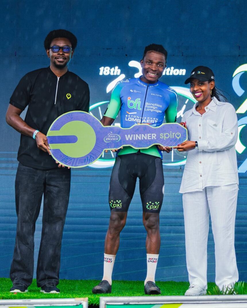 Masengesho Vainqueur ukinira Benediction Banafrica Team yahembwe moto ya Spiro nyuma yo kuba Umunyarwanda witwaye neza mu gace ka munani ka Tour du Rwanda kavaga i Musanze kaza i Kigali ku ntera Km 147,2.