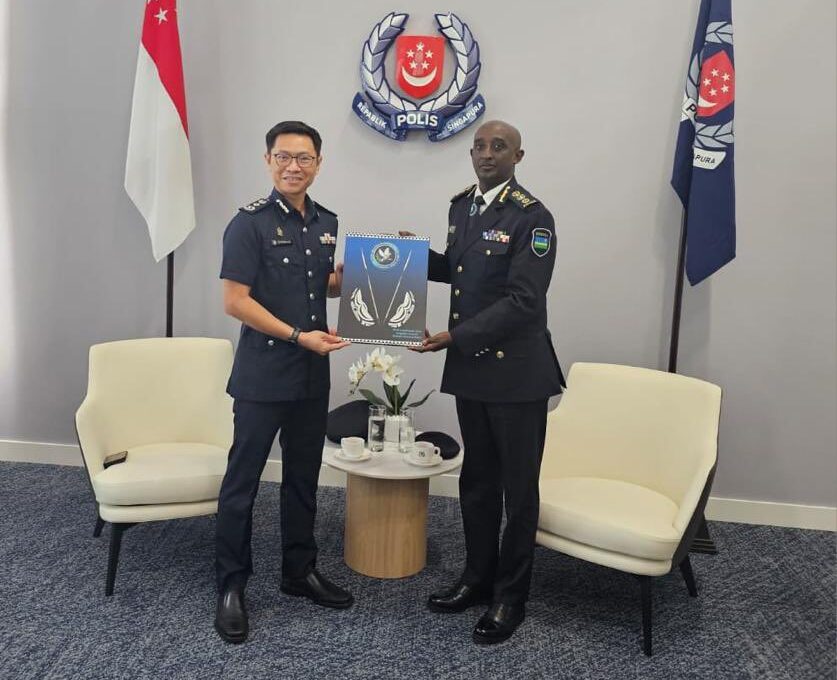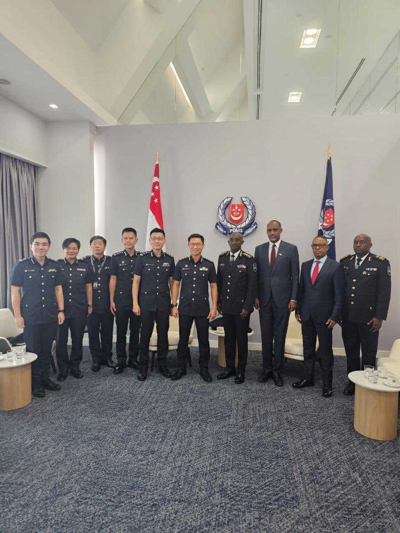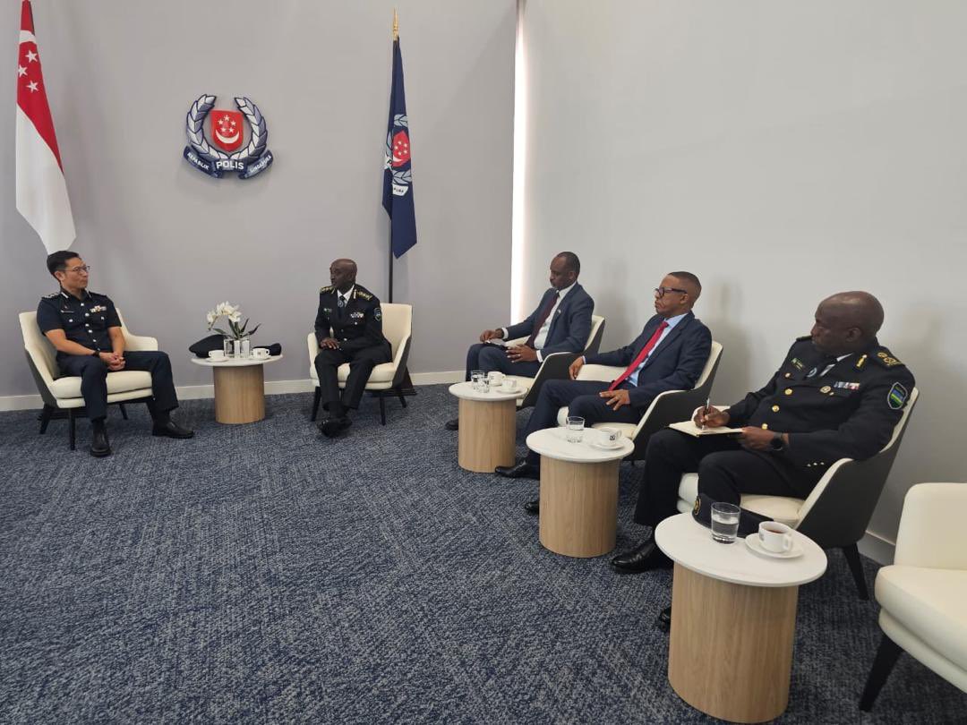 Umuyobozi Mukuru wa Polisi y’u Rwanda CG Felix Namuhoranye, ari kumwe n’Umunyamabanga Mukuru w’Urwego rw’igihugu rw’Ubugenzacyaha, RIB , Col (Rtd) Pacifique K. Kabanda, na Ambasaderi w’u Rwanda muri Singapore, Amb.Innocent Muhizi, bagiranye ibiganiro n’Umuyobozi wa Polisi ya Singapore, How Kwang Hwee.